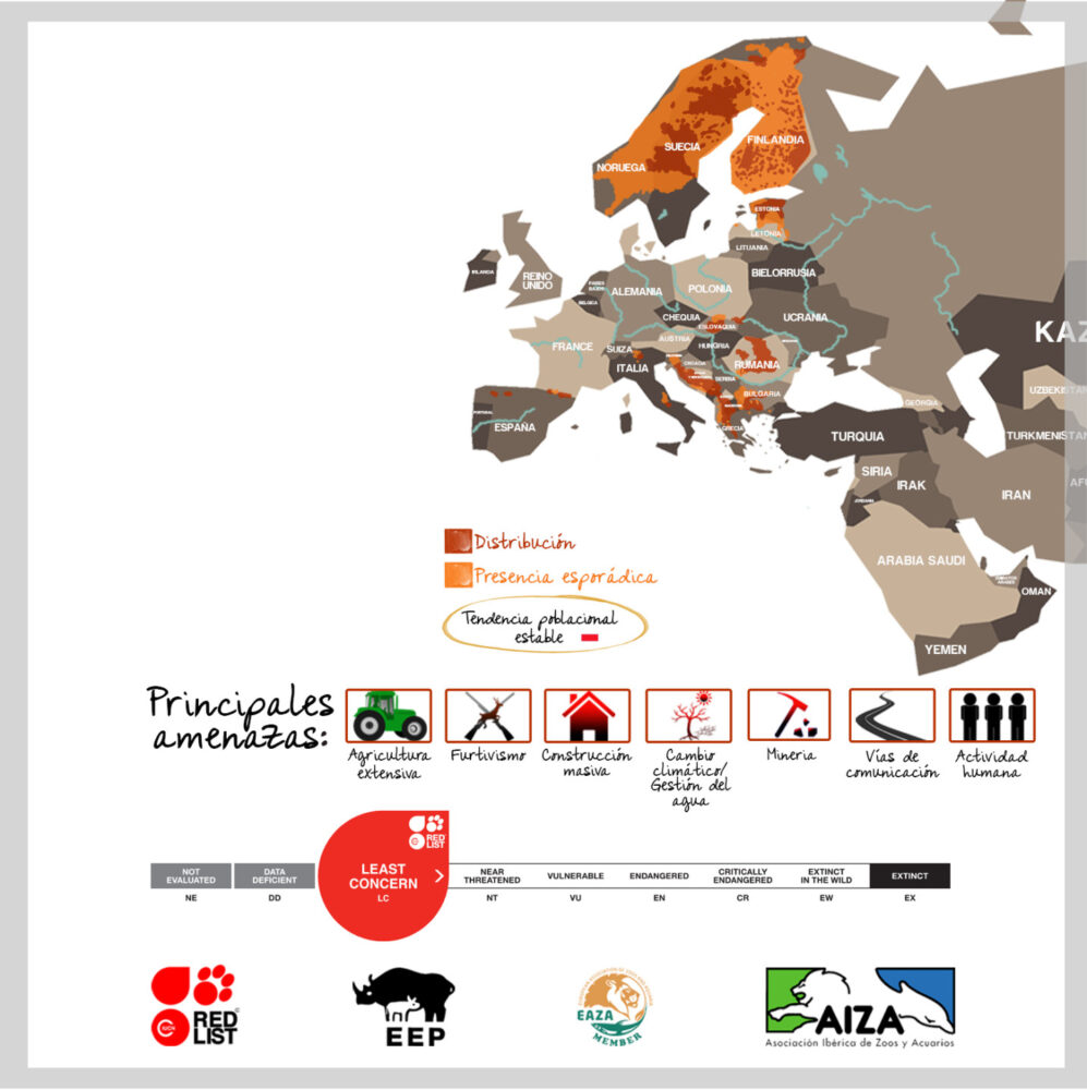 El oso pardo es el gigante entre los mamíferos de la Península Ibérica y el emblema de nuestros bosques, aunque ha visto reducido su hábitat al Pirineo y a la Cordillera Cantábrica, donde su población ocupa 4 comunidades: Castilla y León, Asturias, Cantabria y Galicia. La población actual en la península está en torno a los 350 ejemplares, de los cuales aproximadamente un 30% se encuentran en Cantabria.